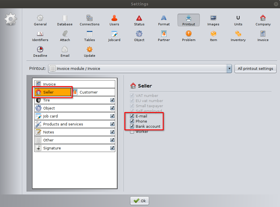 Only the fields that are enabled here will be displayed on the invoice printout.