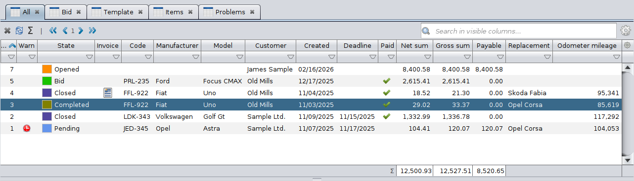 - Columns display key information such as status, customer, dates, and amounts.