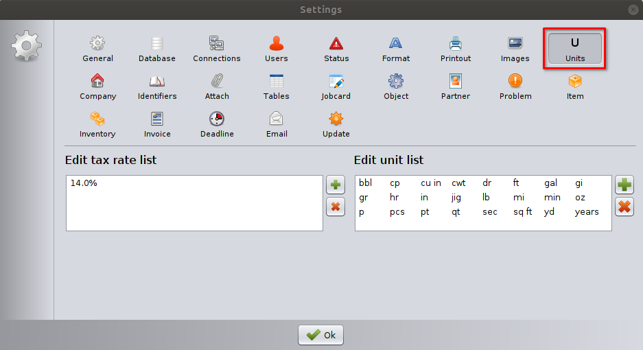 This opens the Units settings window, where you can customize your tax rate and unit lists.