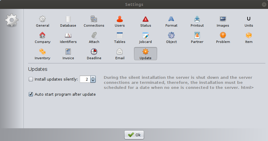 The Update Settings section controls how software updates are installed and how the application behaves after an update.